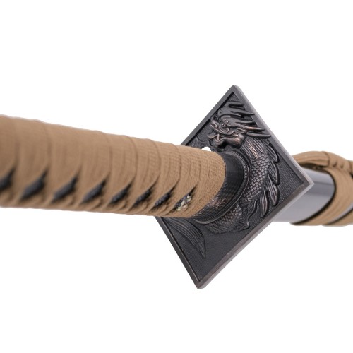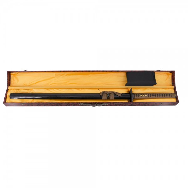 Katana Funcional de 106 cm hoja de acero al carbono AISI 1045 acabada en negro con filo, con vaina negra y encordado marrón, mango con encordado marrón con caja de madera forrada de tejido decorativo de presentación.