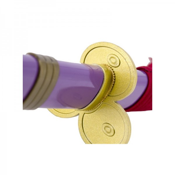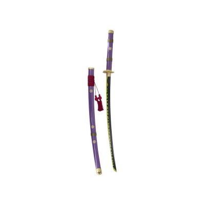 Réplica no oficial acabada en lila, de 108 cm hoja de acero al carbono AISI 1045 acabada en negro con detalles en el corte amarillos y verdes, con vaina lila con detalles dorados y encordado rojo, mango lila con con detalles dorados, con caja de madera forrada de tejido decorativo de presentación.