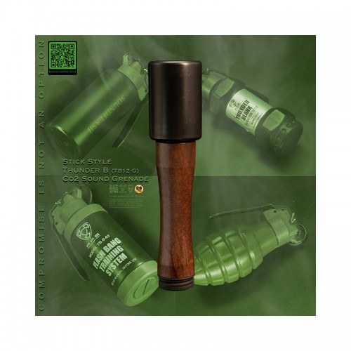 Con un color y una forma, así como el manejo sorprendentemente similares a las granadas de mano alemanas de las II Guerra Mundial, sorprende su potente sonido (130 Db). Funciona con una cápsula de CO2. Marcado CE.